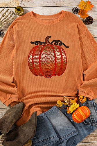 Orange Sequined Pumpkin Ribbed Round Neck Halloween Sweatshirt